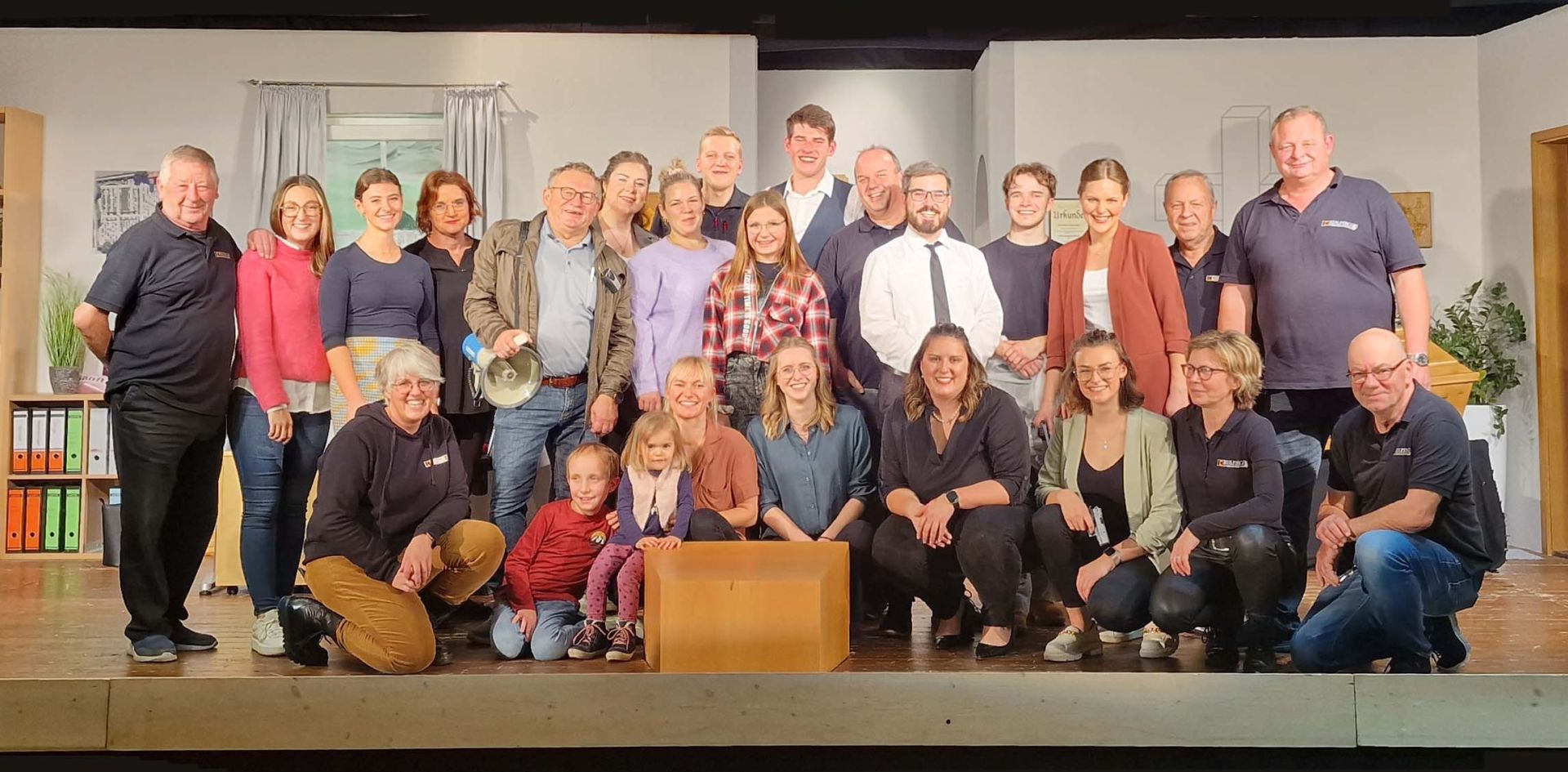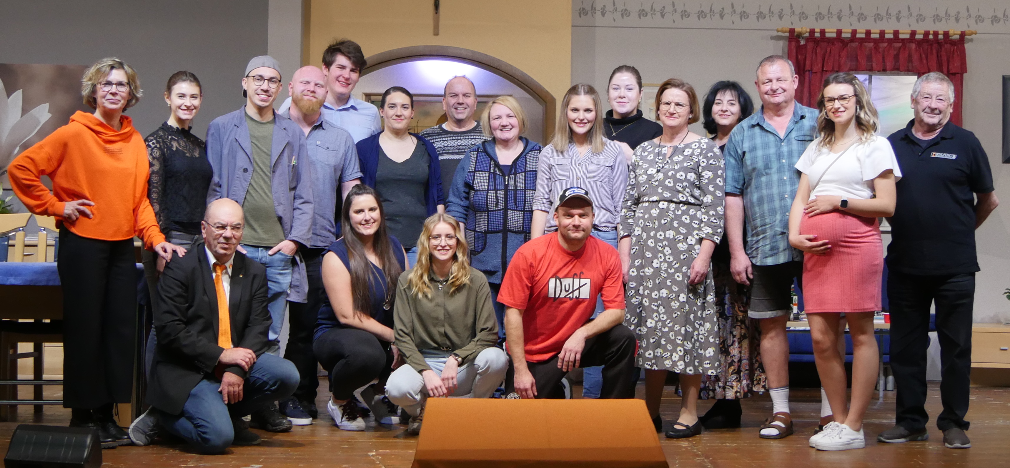 In unserer Theatergruppe bringen sich alle ein: Sei es als Spielerin und Spieler, als Regisseur, in der Maske, beim Bühnenbau und Bühnentechnik, bei der Bewirtung, beim Kartenverkauf und bei der Werbung - von jung bis alt arbeiten Mitglieder aller Generationen alljährlich mit und helfen, daß die Theatersaison ein Erfolg wird.
