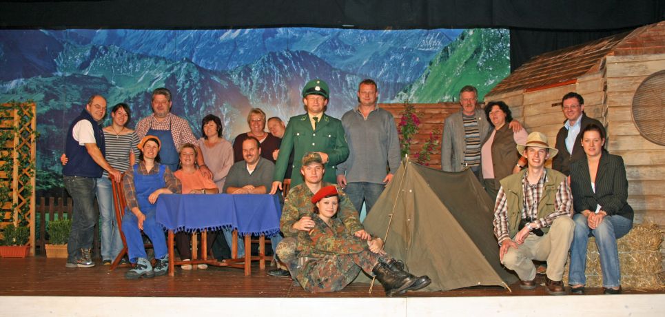 Im Bild von links: Karlheinz Hitzler (Bühnenbau), Franziska Radinger (Souffleuse), Sigrid Ballis, Hans Huber, Doris Giggenbach, Sigrid Schaller (Maske, Frisuren), Wolfgang Lob (Bühnenbau, Beleuchtung), Veronika Lob (Maske), Gerald Giggenbach, Jakob Kehrle, Simon Kehrle, Franziska Prügel, Roland Kehrle (Regie), Gerd Kommer, Ingrid Eggenmüller, Peter Dietrich, Robert Poss (1. Vorsitzender), Isabella Lipp